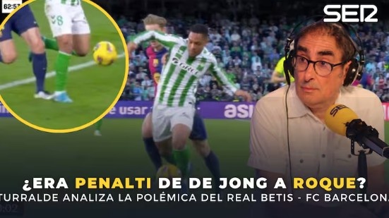 12月8日訊 西甲第16輪,巴薩2-2戰(zhàn)平貝蒂斯。比賽第65分鐘,羅克與德容爭搶后禁區(qū)內(nèi)倒地。VAR介入,主裁親自觀看回放,判罰點(diǎn)球。