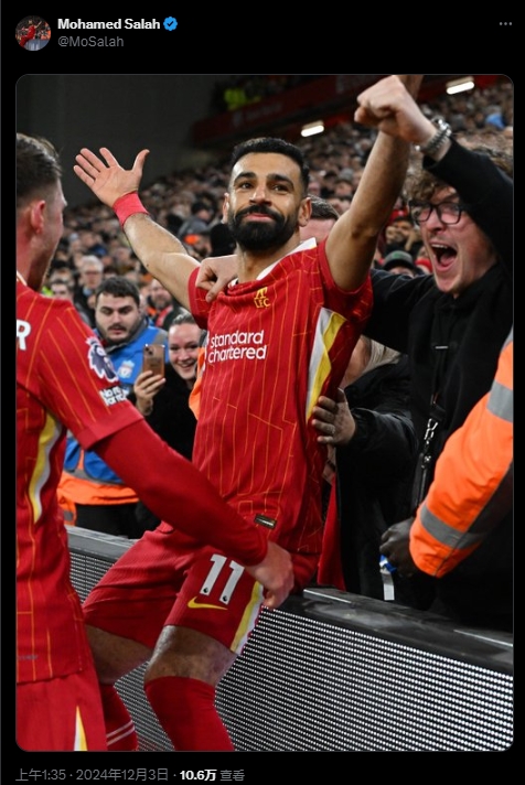 12月03日訊 利物浦球星薩拉赫剛剛更新了自己的社交媒體賬號,曬出慶祝照片,這一動態(tài)沒有配文。