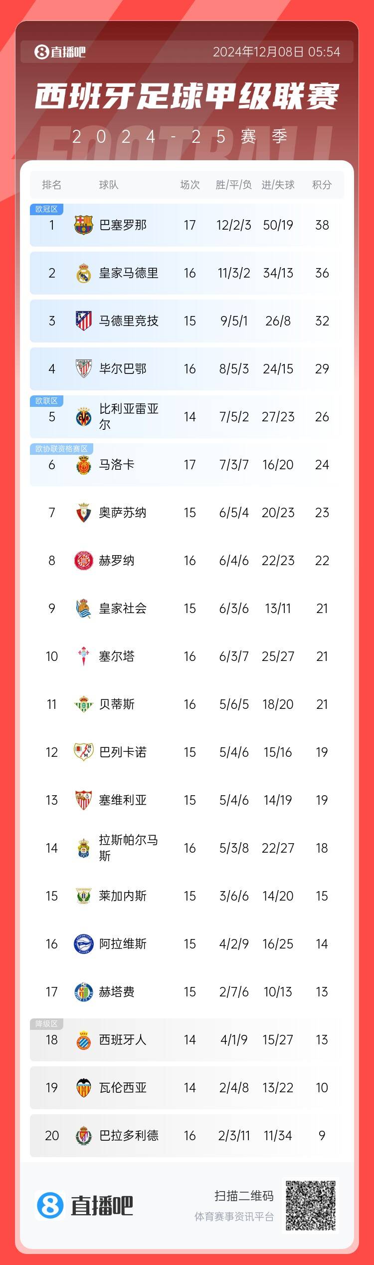 12月8日訊 西甲第16輪,皇馬客場3-0赫羅納,少賽落后榜首2分。