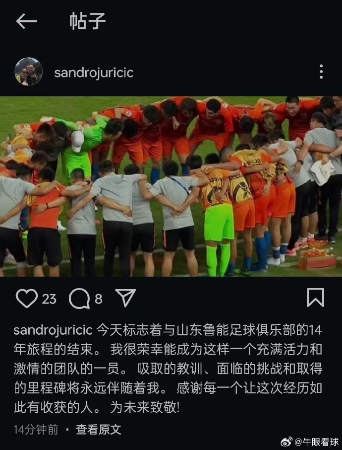牛志明曬出了桑德羅向泰山俱樂部告別的社媒,他分析寫道:“群里看到的桑德羅的動(dòng)態(tài),14年,滿滿都是記憶,他應(yīng)該是專心在國家隊(duì)當(dāng)隊(duì)醫(yī)了吧,伊萬之前就把他選進(jìn)了國家隊(duì)。未來,好運(yùn)。”