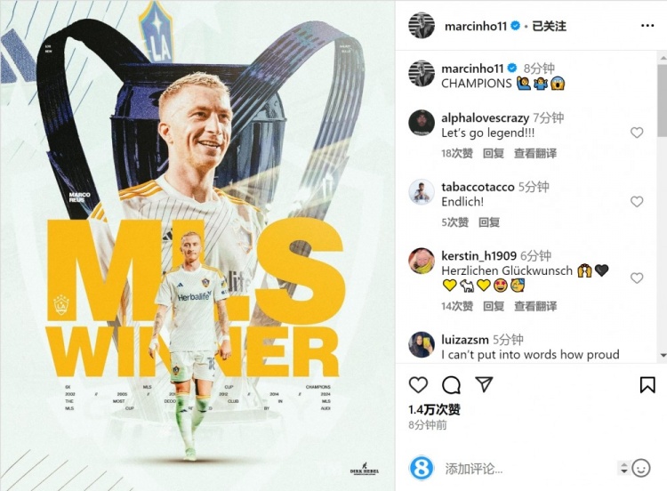 12月8日訊 在美職聯(lián)總決賽中,35歲羅伊斯替補(bǔ)出場,最終洛杉磯銀河2-1擊敗紐約紅牛,捧起冠軍獎杯。