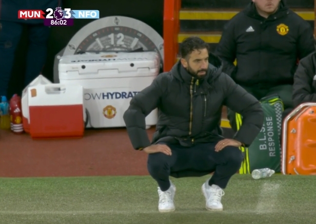 英超第15輪,曼聯(lián)主場2-3不敵諾丁漢森林。新帥阿莫林在比賽中在又在場邊蹲下↓
