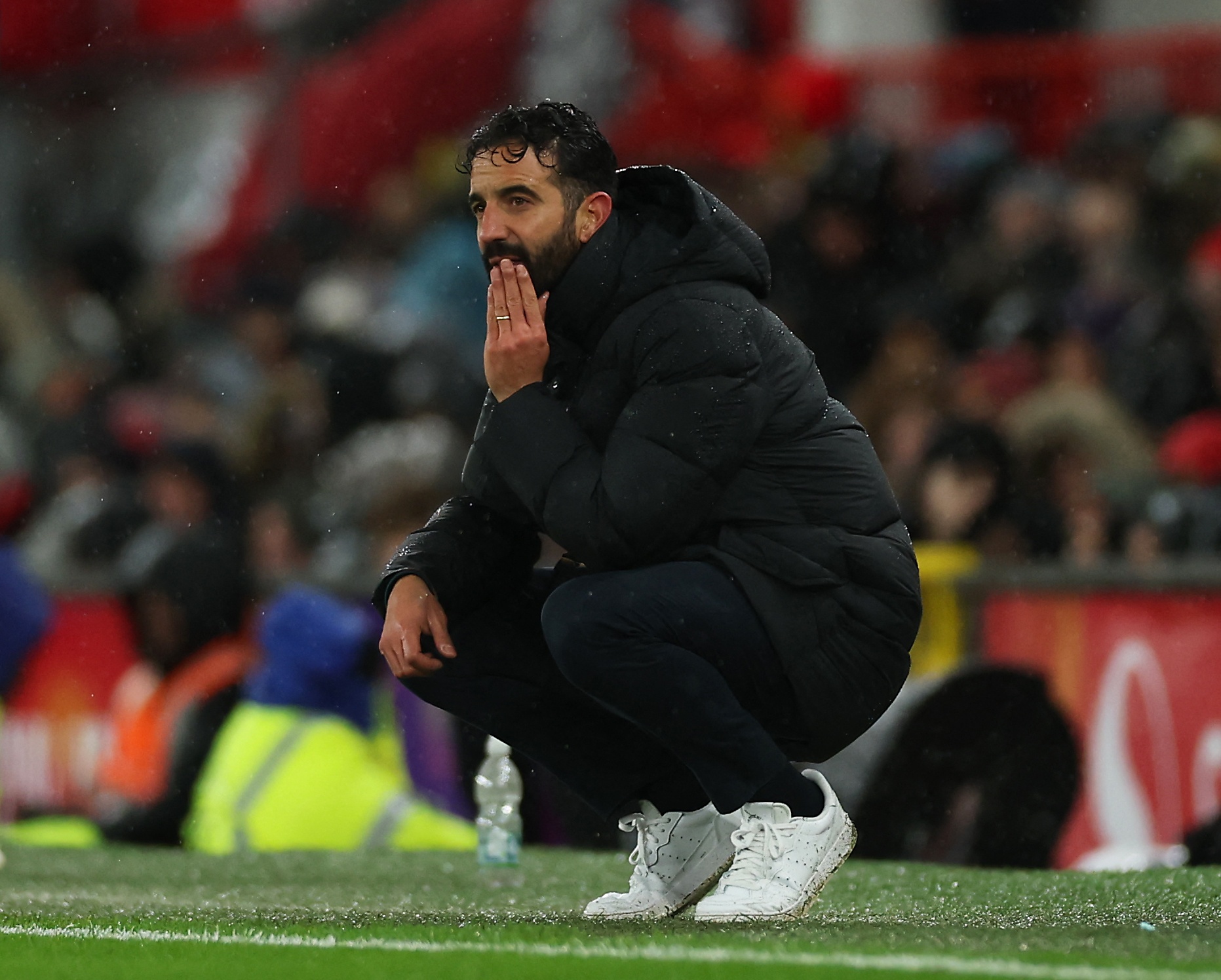 在帶隊首秀1-1戰(zhàn)平伊普斯維奇的比賽中,阿莫林也在場邊蹲下,并且掩面扶額↓