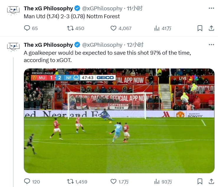另外,本場比賽曼聯(lián)全場獲得了1.74的預(yù)期進球值,但只打進2球,森林僅有0.78的預(yù)期進球值,結(jié)果3次攻破曼聯(lián)球門。