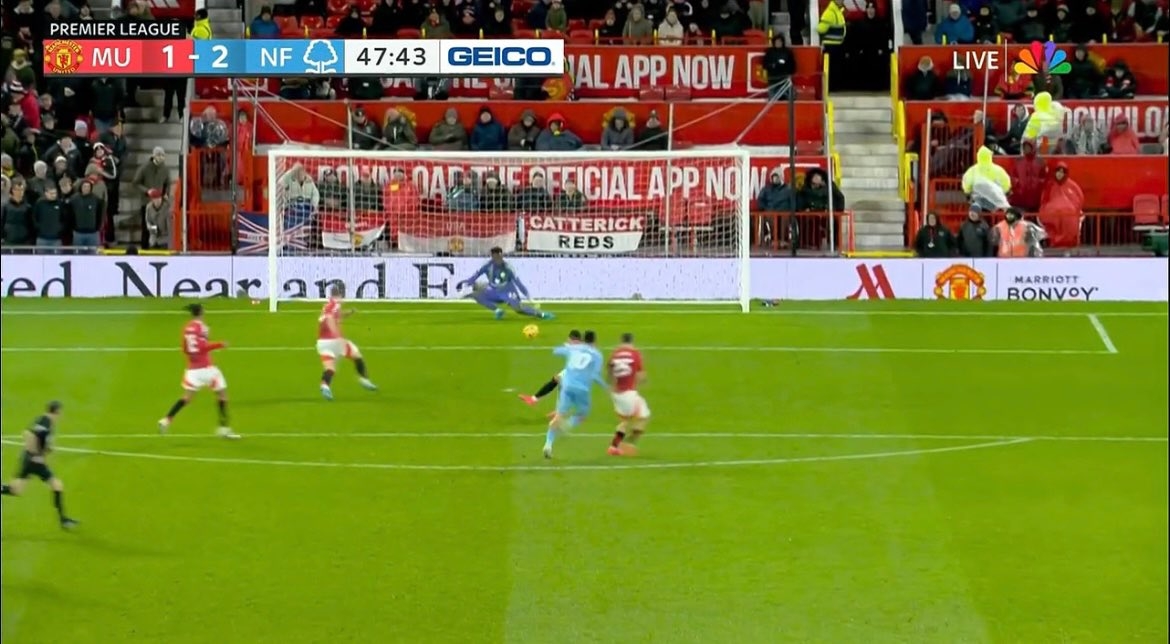 本場比賽第47分鐘,B費和約羅后場配合失誤,懷特得球后遠(yuǎn)射洞穿奧納納球門,讓諾丁漢森林客場取得2-1的領(lǐng)先。