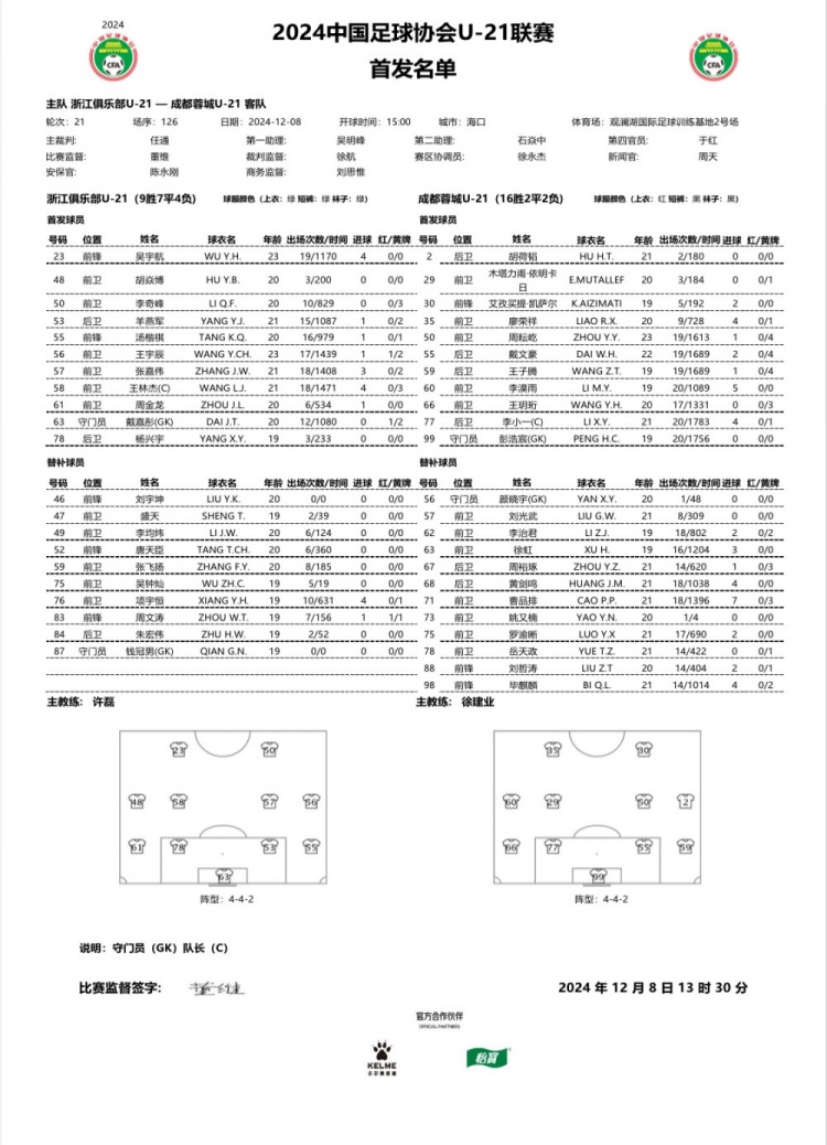 12月8日訊 U-21聯(lián)賽已進行至決賽第五階段的關鍵期,第21輪比賽中,成都蓉城U21將與浙江U21展開較量。本輪比賽中,國腳胡荷韜繼續(xù)代表蓉城U21隊首發(fā)出戰(zhàn)。