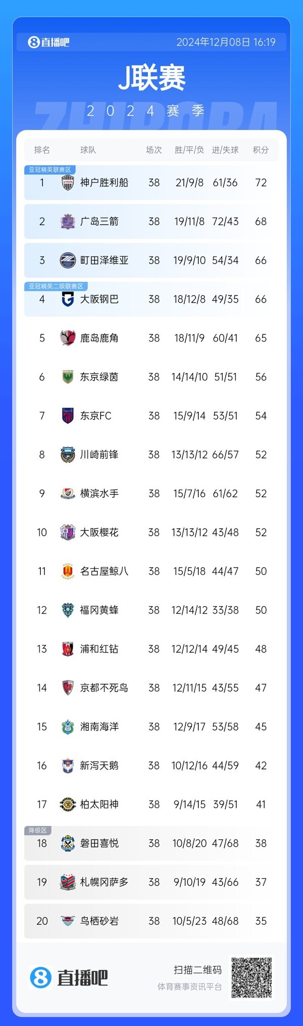降級的3支隊伍也已產(chǎn)生,磐田喜悅末輪客場0-3不敵已經(jīng)提前降級的鳥棲沙巖,時隔兩年重返J1聯(lián)賽后又立即降級。降級的三支球隊為鳥棲沙巖、札幌岡薩多、磐田喜悅。