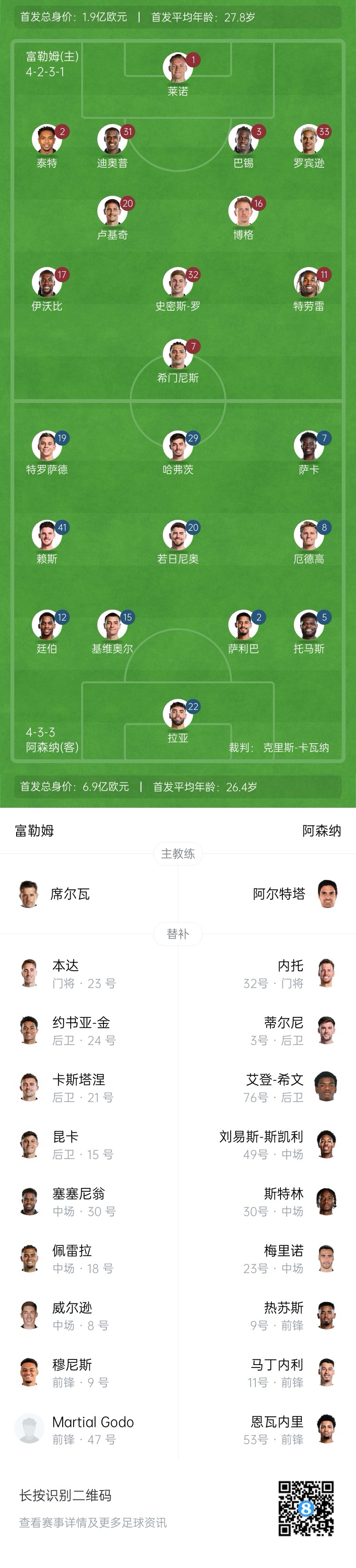 富勒姆首發(fā):1-萊諾、2-泰特、3-巴錫、31-伊薩-迪奧普、33-安東尼-羅賓遜、20-盧基奇、16-貝格、17-伊沃比、32-史密斯-羅、7-勞爾-希門尼斯、11-阿達瑪-特勞雷