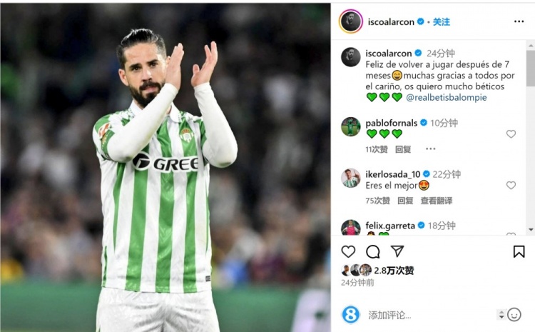 伊斯科今年5月份受傷,現(xiàn)在終于復(fù)出,這位32歲的西班牙中場(chǎng)在社交媒體上寫道:“很高興時(shí)隔7個(gè)月重返賽場(chǎng)。感謝大家的厚愛,我非常愛你們,所有的貝蒂斯球迷。”