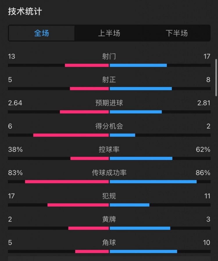 除特別注明外,本站所有內(nèi)容均為24直播網(wǎng)整理排版,轉(zhuǎn)載請(qǐng)注明出處:熱刺3-4切爾西全場(chǎng)數(shù)據(jù):射門13-17,控球率38%-62%,犯規(guī)17-11