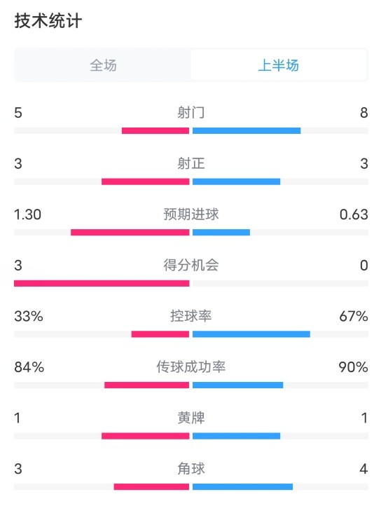 半場數(shù)據(jù)如下(切爾西在后):