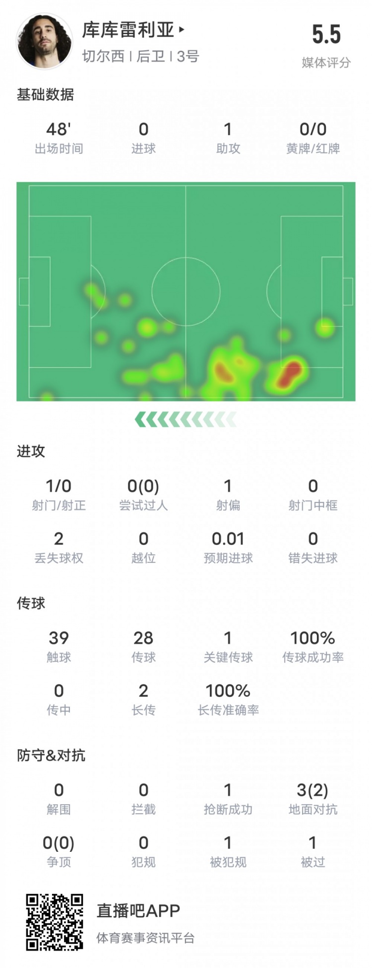 12月9日訊 英超聯(lián)賽第15輪,切爾西客戰(zhàn)熱刺,庫(kù)庫(kù)雷利亞首發(fā)出戰(zhàn),送出1次助攻,1次關(guān)鍵傳球,傳球成功率100%,但兩次滑倒導(dǎo)致球隊(duì)丟球,半場(chǎng)評(píng)分5.5。