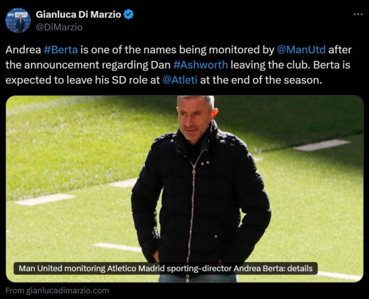 12月9日訊 昨天,曼聯(lián)官方宣布,體育總監(jiān)阿什沃斯離職。據(jù)意大利名記迪馬濟(jì)奧報(bào)道,在阿什沃斯離任后,曼聯(lián)正在關(guān)注潛在的繼任者,其中包括馬競(jìng)體育總監(jiān)貝爾塔。