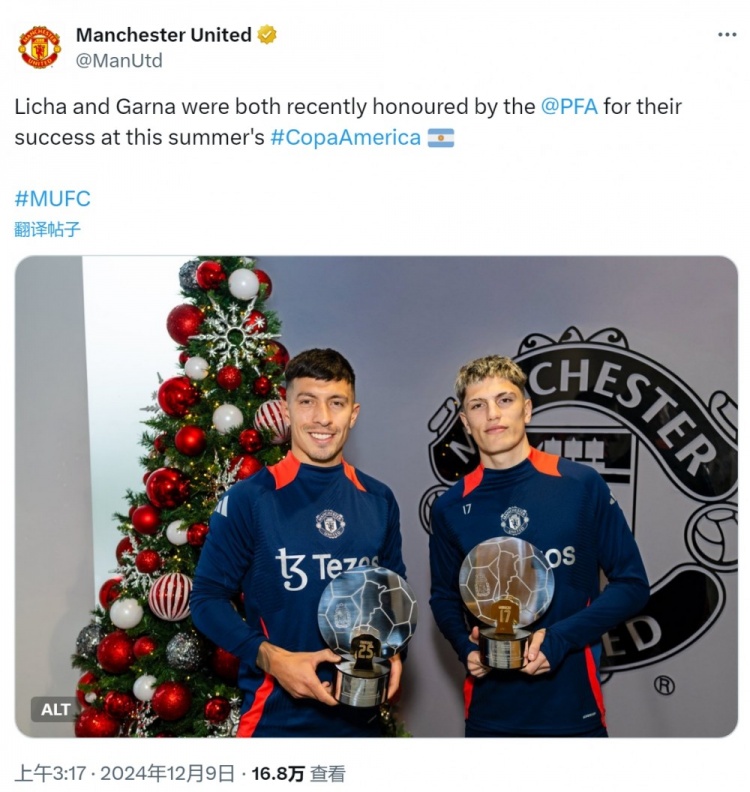 利桑德羅、加納喬今夏隨阿根廷隊(duì)贏得美洲杯冠軍,PFA向他們頒發(fā)榮譽(yù)獎(jiǎng)杯,曼聯(lián)官方社媒曬出兩人領(lǐng)取獎(jiǎng)杯的照片,對(duì)他們表示祝賀。
