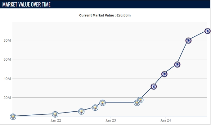 22歲的帕爾默在去年夏窗加盟切爾西,當(dāng)時(shí)的帕爾默身價(jià)僅有1800萬(wàn)歐,加盟之時(shí)普遍不被看好。如今一年半過(guò)去,帕爾默不僅成為了切爾西頭號(hào)球星+核心,身價(jià)也暴漲至9000萬(wàn)歐。