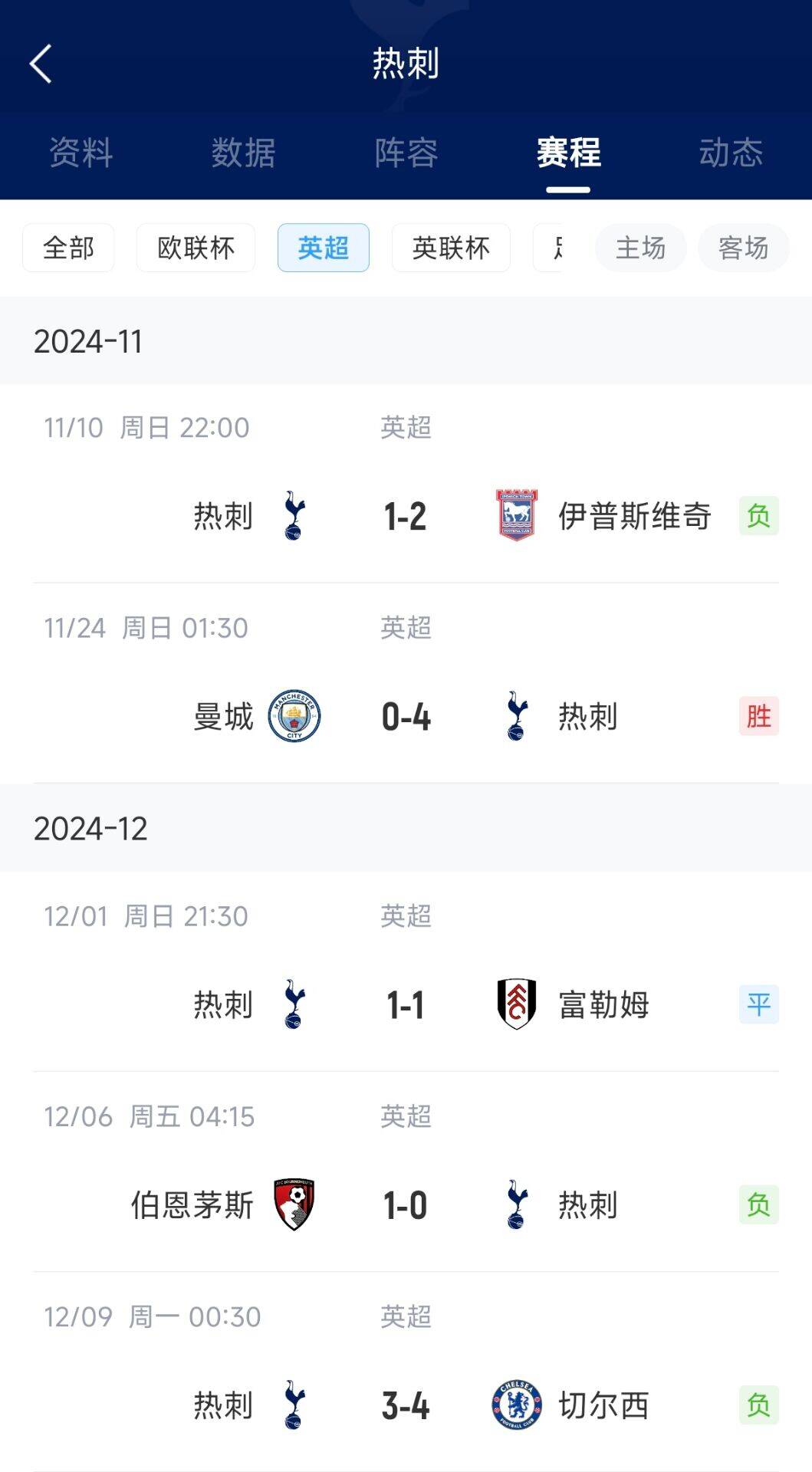 12月09日訊 熱刺在英超第15輪3-4不敵切爾西,近5輪英超1勝1平3負(fù)只拿了4分。