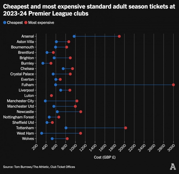 (圖片說明)23/24賽季各俱樂部英超成人票價(藍點為最低檔票價;紅點為最高檔票價)