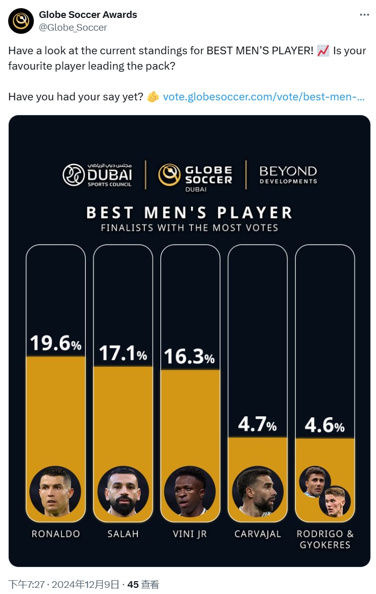 根據(jù)官方公布的目前前五的獲票情況來看,C羅以19.6%領(lǐng)跑,力壓17.1%的薩拉赫以及16.3%的維尼修斯,卡瓦哈爾4.7%排第四,羅德里和約克雷斯獲4.6%排第五。本年度環(huán)球足球獎最佳男足球員候選名單戳>>