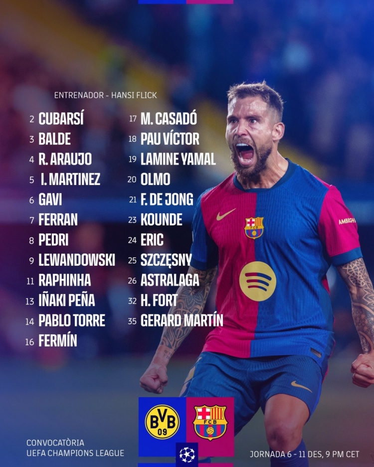 12月10日訊 北京時(shí)間12月12日凌晨4點(diǎn),巴薩將在歐冠第6輪比賽中客場對(duì)陣多特,巴薩公布了此役的球員名單,萊萬、亞馬爾、拉菲尼亞在列,阿勞霍回歸。