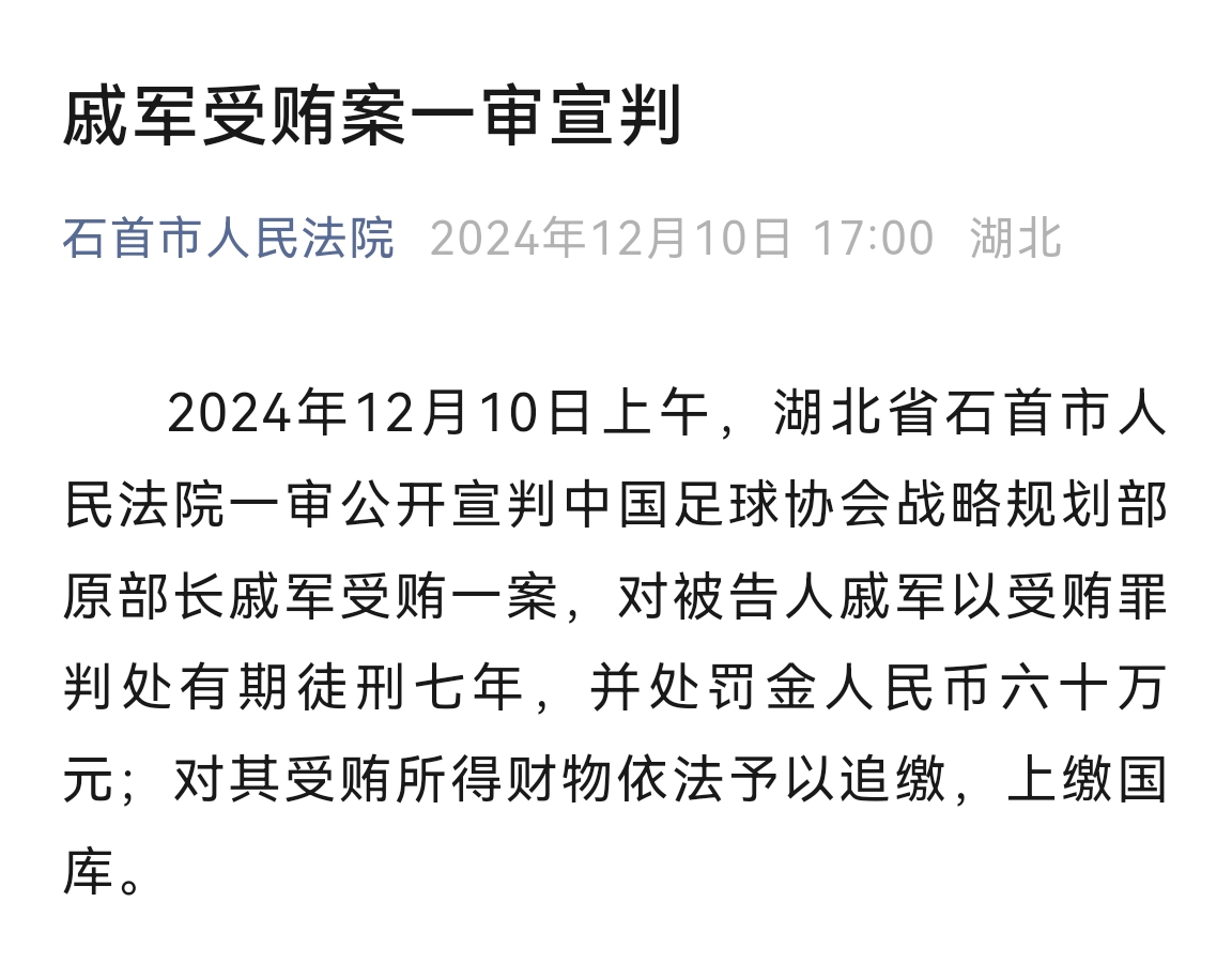 - 足協(xié)戰(zhàn)略規(guī)劃部原部長戚軍以受賄罪被判有期徒刑7年,處罰金60萬