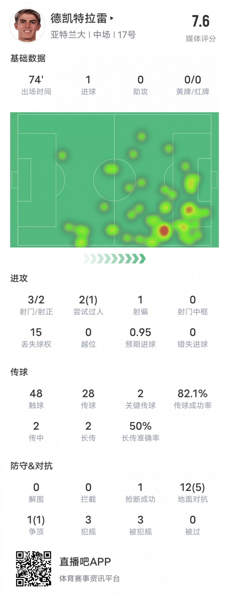 德凱特拉雷本場比賽數(shù)據(jù)如下: