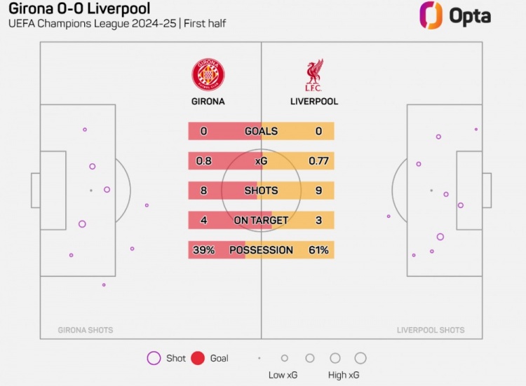 上半場比賽,赫羅納有8腳射門命中目標的射門數(shù)為4腳,他們是本賽季歐冠賽場上面對利物浦上半場比賽射門最多的球隊。