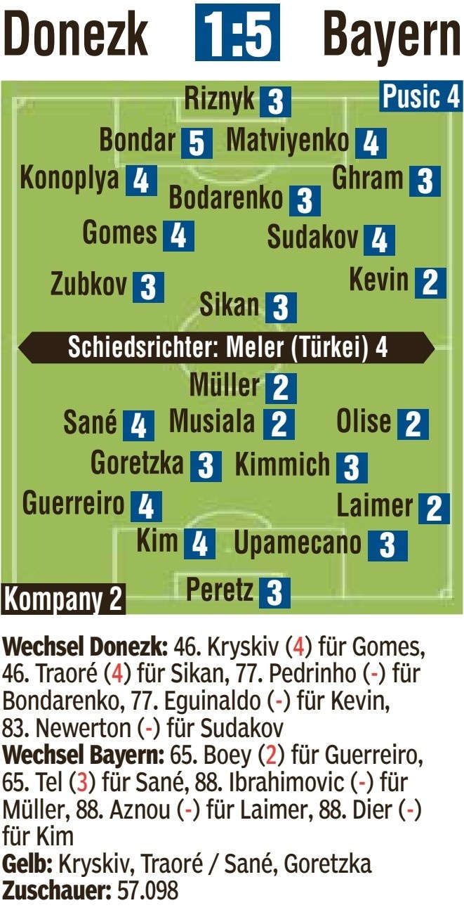 12月11日訊 在歐冠第6輪比賽中,拜仁5-1擊敗頓涅茨克礦工,賽后德國媒體《圖片報》對兩隊球員進行了評分,穆勒、穆西亞拉、奧利塞等球員2分最高。