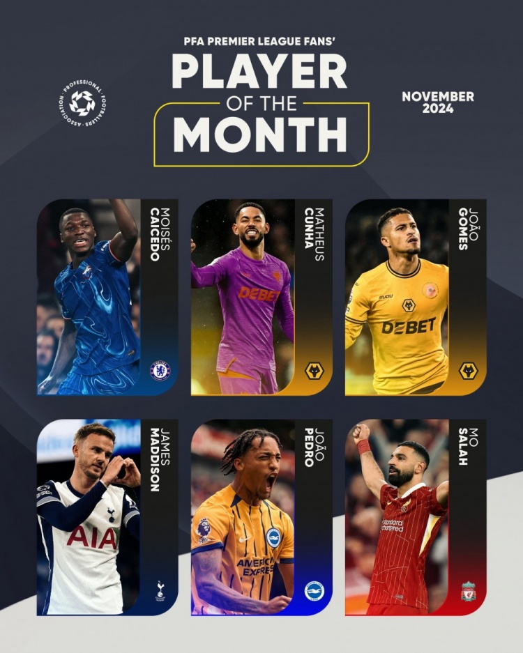12月3日訊 PFA(英格蘭職業(yè)球員工會(huì))公布了球迷票選英超11月最佳球員的候選名單,薩拉赫、麥迪遜、凱塞多在列。