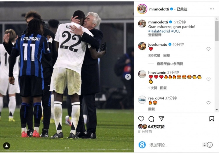 皇馬主帥安切洛蒂更新社媒動態(tài),慶祝球隊取勝。安切洛蒂曬出與呂迪格擁抱的照片,配文:“出色的表現(xiàn),精彩的比賽!”