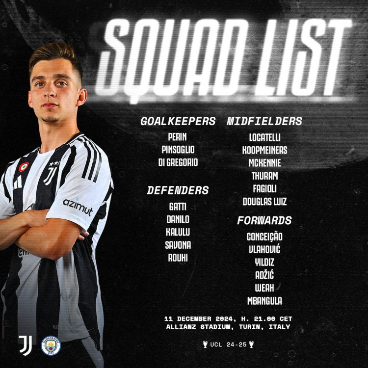 12月11日訊 北京時(shí)間明天凌晨4點(diǎn),尤文將在歐冠第6輪比賽中主場(chǎng)對(duì)陣曼城,尤文公布了此役的球員名單,麥肯尼、道格拉斯-路易斯回歸,坎比亞索缺席。