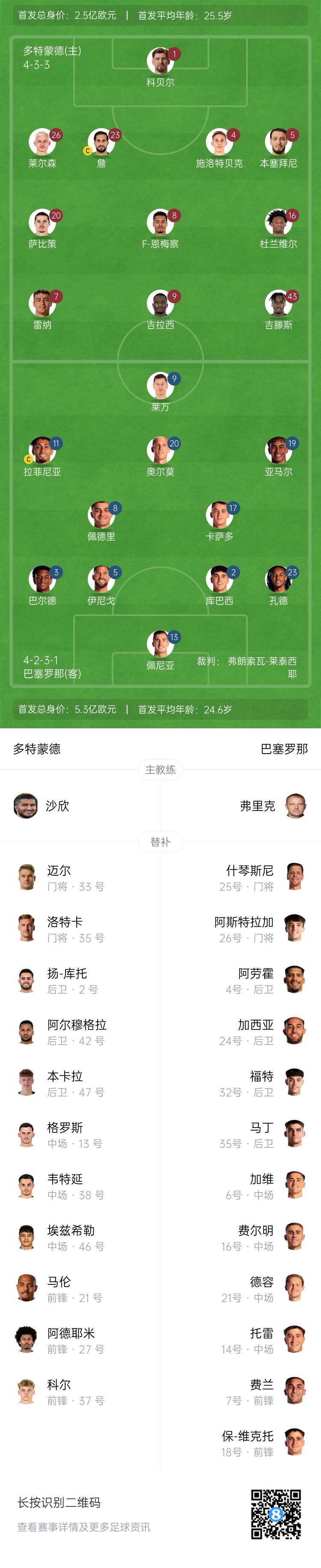 多特首發(fā):1-科貝爾、4-施洛特貝克、5-本塞拜尼、23-埃姆雷-詹、26-萊爾森、8-恩梅查、20-薩比策、16-杜蘭維爾、7-雷納、43-吉滕斯、9-吉拉西