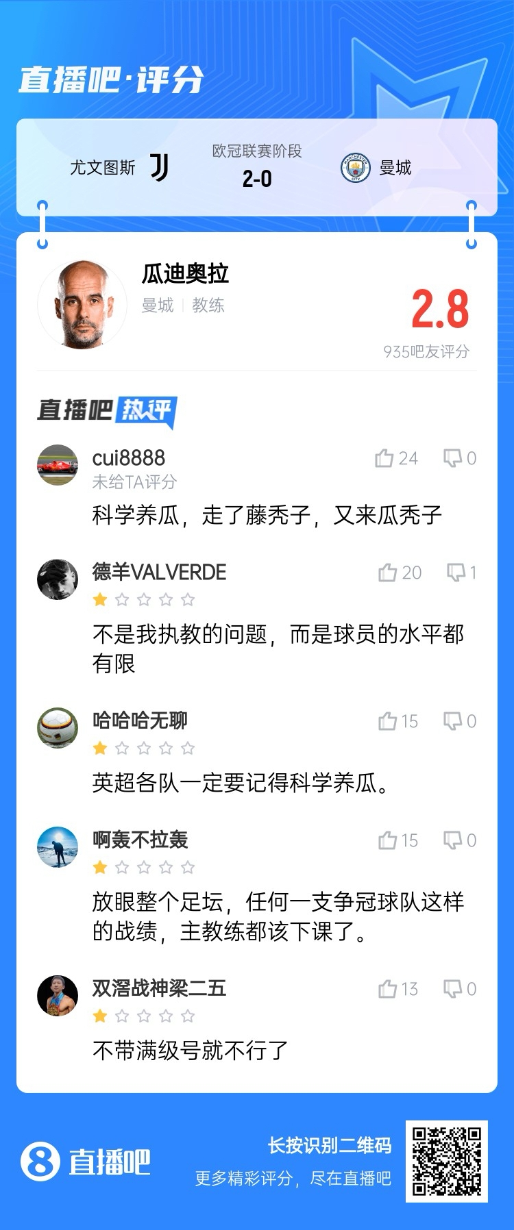 曼城0-2不敵尤文,歐冠三場不勝降至第22名,各賽事近10場僅1勝,吧友評分吐槽瓜迪奧拉的表現(xiàn)。
