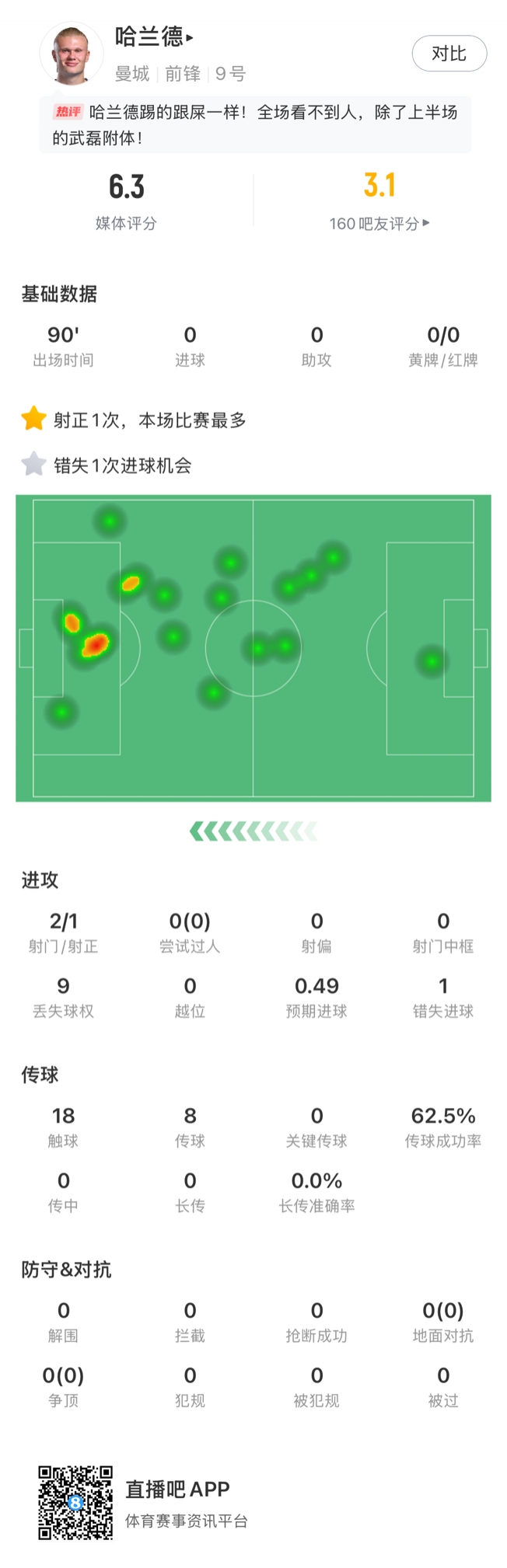 哈蘭德本場比賽有2腳射門,一腳被封堵、一腳射正,錯(cuò)失了一個(gè)單刀機(jī)會(huì)。全程僅有18次觸球和5次成功傳球。獲評(píng)6.3分,是全場最低分。