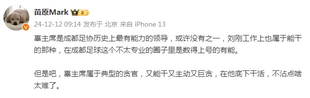 在成都市足協(xié)原專職副主席劉剛被判處有期徒刑八年后,媒體人苗原在社媒點(diǎn)評(píng)了劉剛與成都市足協(xié)原主席辜建明之間的關(guān)系。