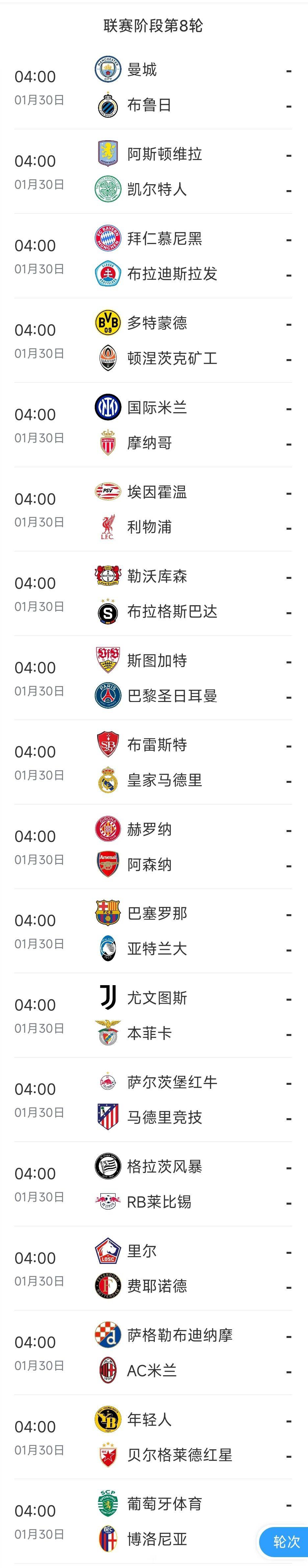 歐冠倒數(shù)第2輪,將在小年夜開戰(zhàn),1月22日與23日凌晨分別打9場(chǎng)。而在歐冠第8輪也即是末輪,1月30日凌晨4點(diǎn)(農(nóng)歷大年初二),歐冠36隊(duì)的18場(chǎng)比賽將同時(shí)開打。