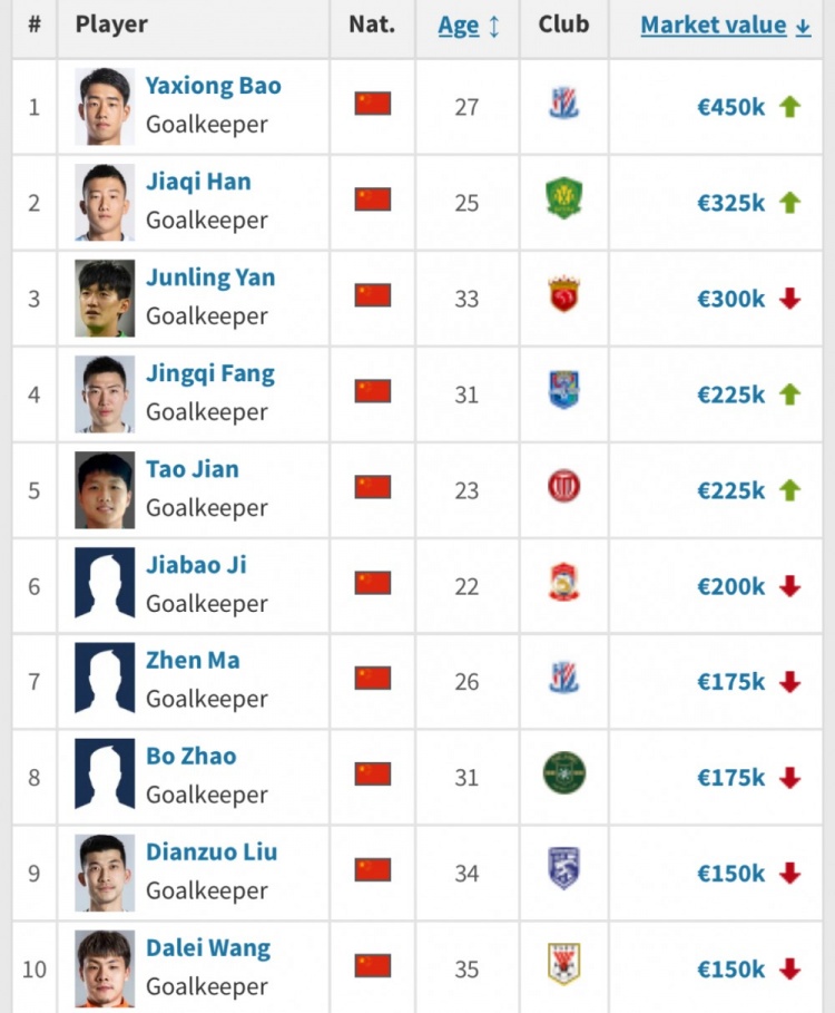 12月12日訊 德國轉會市場網站更新了中超球員身價,在門將位置上,鮑亞雄、韓佳奇、顏駿凌位居前三,劉殿座、王大雷并列第9。