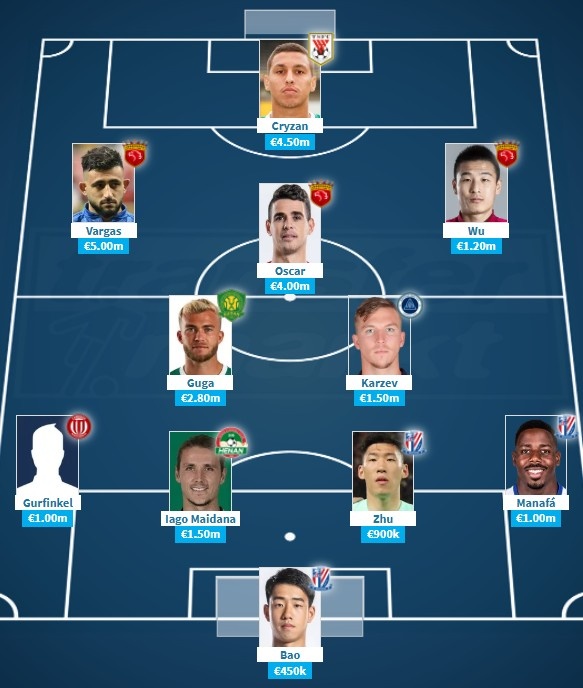前衛(wèi):巴爾加斯(500萬)、奧斯卡(400萬)、武磊(120萬)