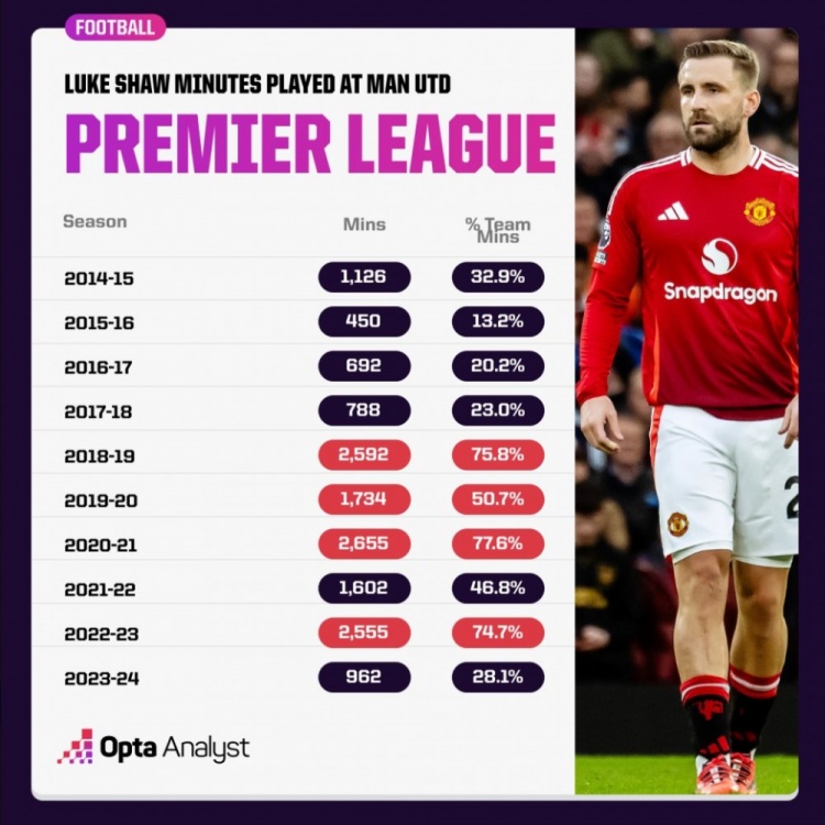 據(jù)Opta Analyst的數(shù)據(jù)統(tǒng)計,在曼聯(lián)效力的10個完整賽季中,盧克-肖在英超聯(lián)賽只有4個賽季的上場時間超過球隊總計比賽時長的50%。