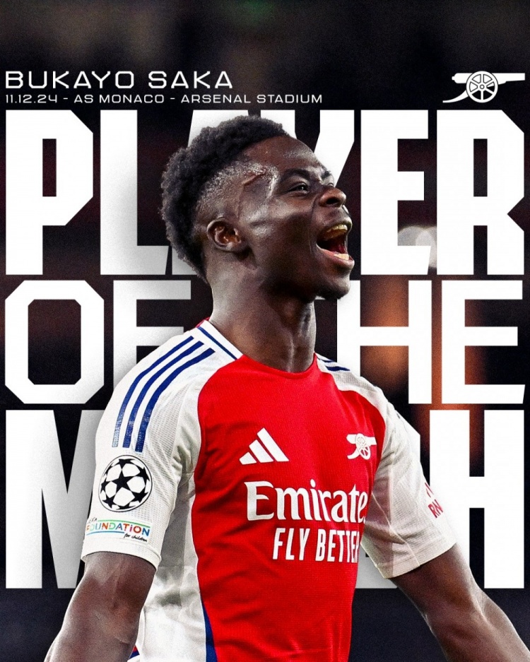 阿森納官方曬出海報,宣布經(jīng)過球迷的投票,薩卡當(dāng)選此役阿森納隊內(nèi)最佳球員。