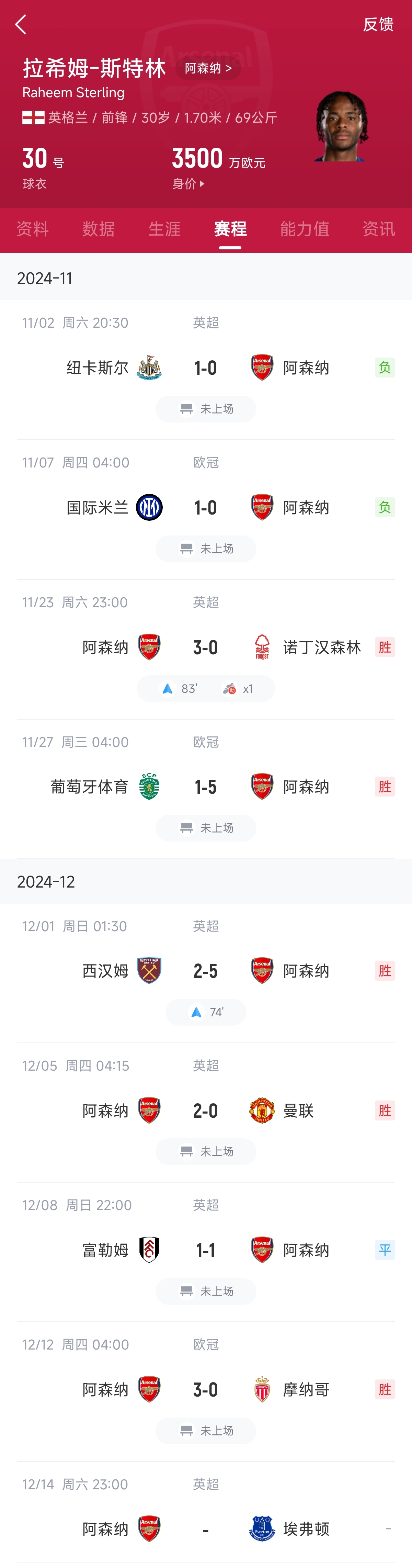 12月12日訊 歐冠第6輪,阿森納3-0擊敗摩納哥,斯特林還是沒有得到登場時間。