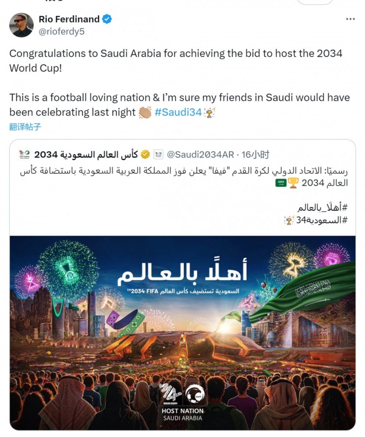 費(fèi)迪南德寫(xiě)道:“祝賀沙特成功申辦2034年世界杯!”