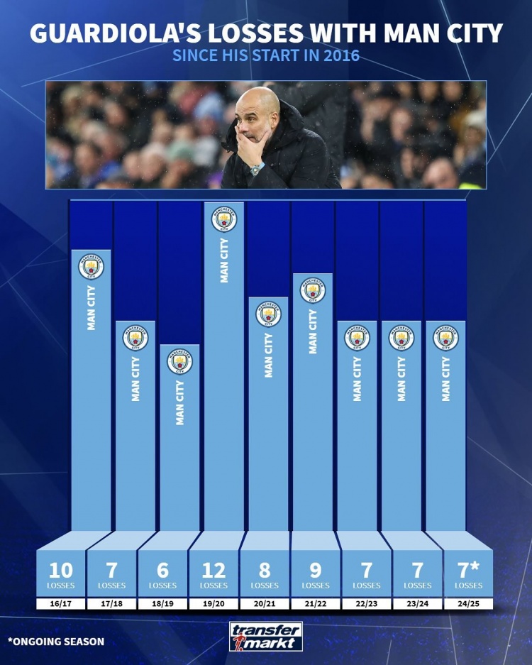 德國(guó)轉(zhuǎn)會(huì)市場(chǎng)統(tǒng)計(jì)了瓜帥執(zhí)教曼城以來(lái)各賽事的輸球場(chǎng)次,并作出對(duì)比。曼城本賽季至今已經(jīng)輸?shù)?場(chǎng)比賽,距離輸球最多的19-20賽季差5場(chǎng)。