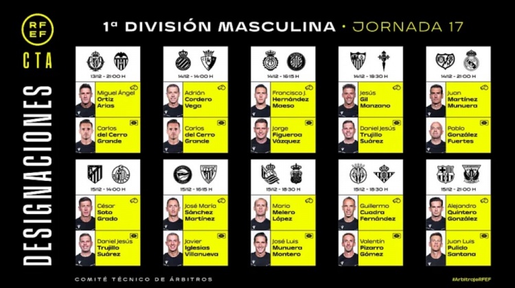 12月12日訊 本周末,西甲聯(lián)賽第17輪將拉開(kāi)戰(zhàn)幕,西班牙足協(xié)官方公布了本輪比賽的裁判安排。穆努埃拉執(zhí)法皇馬客戰(zhàn)巴列卡諾,昆特羅-岡薩雷斯主裁巴薩對(duì)陣萊加內(nèi)斯。