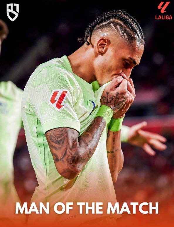12月4日訊 西甲第19輪,巴塞羅那5-1客勝馬洛卡,賽后,拉菲尼亞當(dāng)選全場最佳。