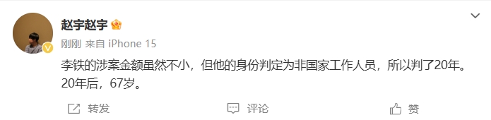 記者趙宇寫道:李鐵的涉案金額雖然不小,但他的身份判定為非國(guó)家工作人員,所以判了20年。20年后,67歲。 ???
