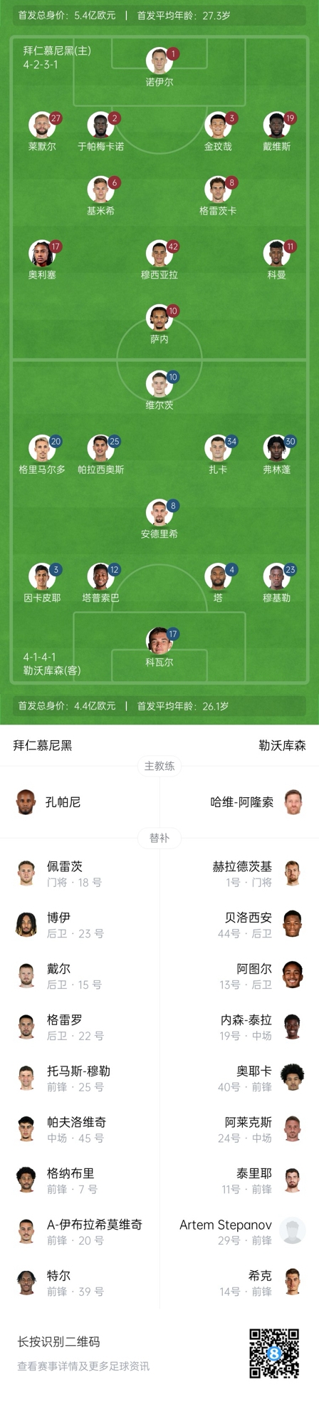拜仁首發(fā):1-諾伊爾、2-于帕梅卡諾、3-金玟哉、19-戴維斯、27-萊默爾、6-基米希、8-格雷茨卡、42-穆西亞拉、11-科曼、17-奧利塞、10-薩內(nèi)