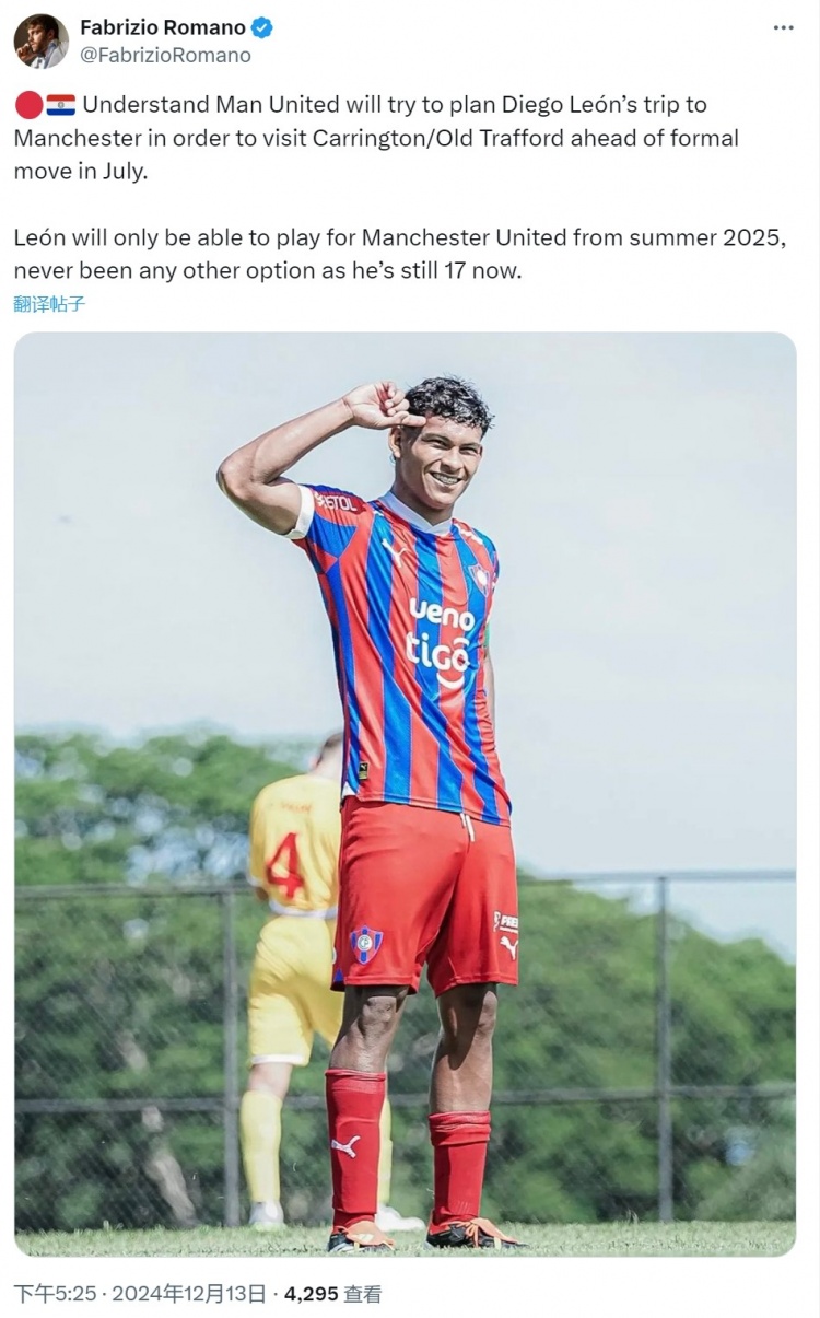 根據(jù)羅馬諾此前的報(bào)道,曼聯(lián)敲定波特諾山丘左后衛(wèi)迭戈-萊昂,由于球員只有17歲,他將在明夏正式加盟。