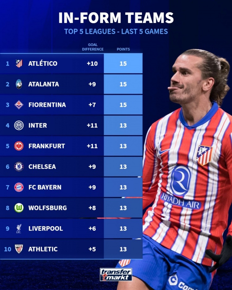 12月13日訊 德國(guó)轉(zhuǎn)會(huì)市場(chǎng)統(tǒng)計(jì)了五大聯(lián)賽球隊(duì)近5場(chǎng)比賽拿到的積分,并列出五大聯(lián)賽狀態(tài)榜,馬競(jìng)、亞特蘭大、佛羅倫薩拿滿15分居首。