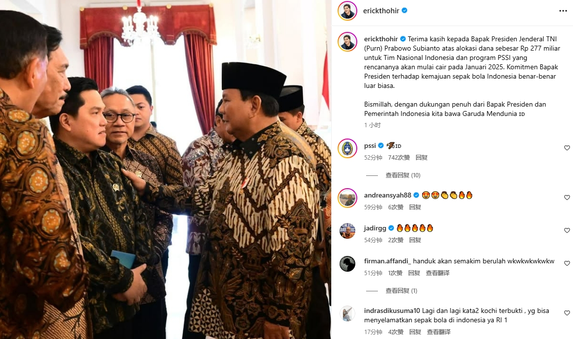 12月13日訊 印尼足協(xié)主席托希爾發(fā)文,宣布印尼總統(tǒng)將分配2770億印尼盾預(yù)算給印尼足協(xié)。