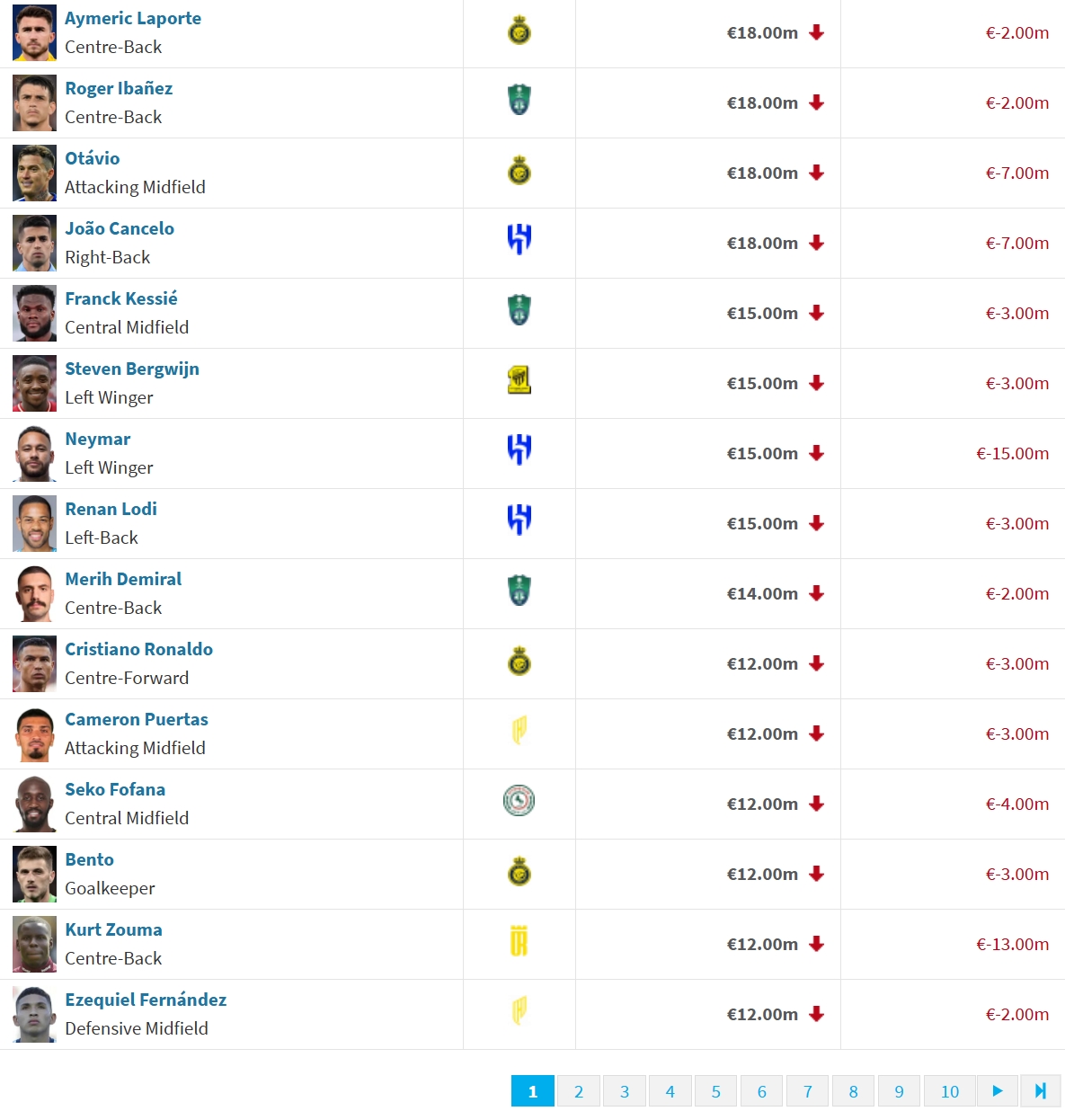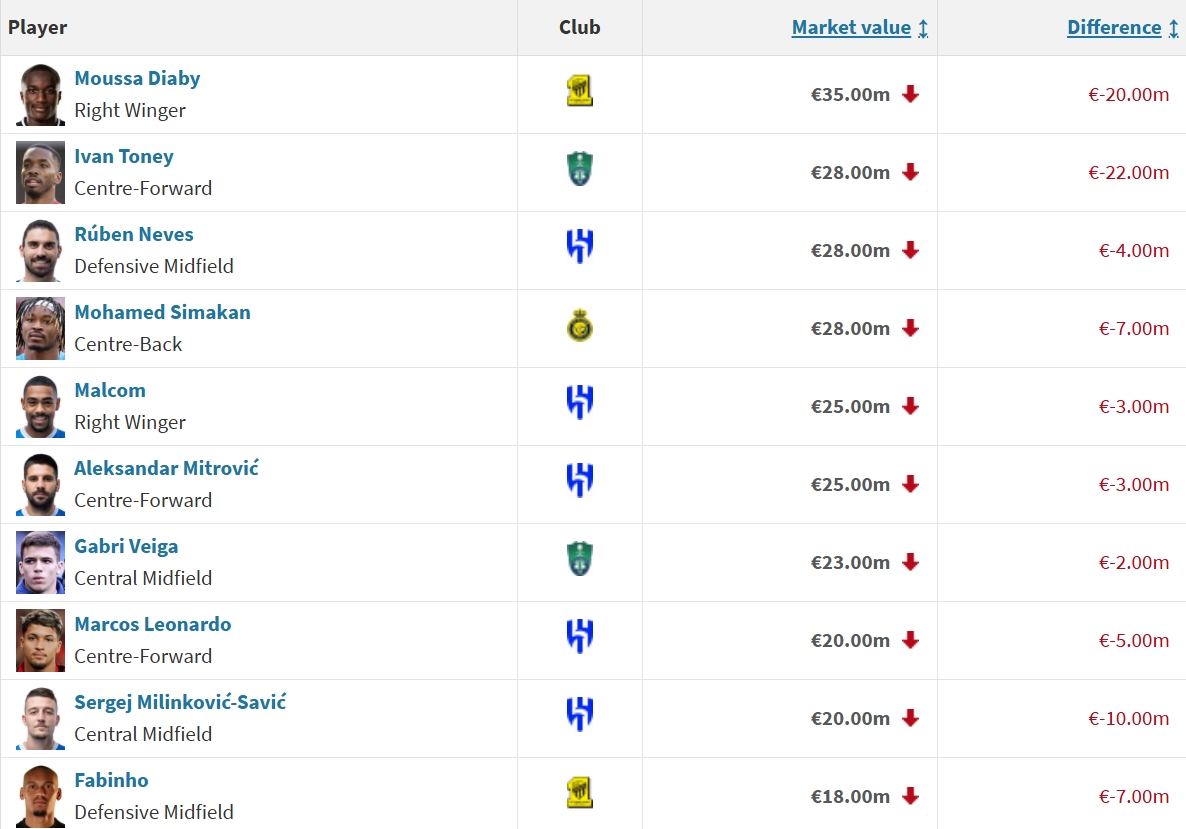 12月13日訊 今日德國轉會市場更新沙特聯(lián)球員身價,其中排名前50位的球員身價全部下跌,穆薩-迪亞比暴跌2000萬歐仍是沙特聯(lián)身價最高球員,伊萬-托尼暴跌2200萬,內馬爾暴跌1500萬。
